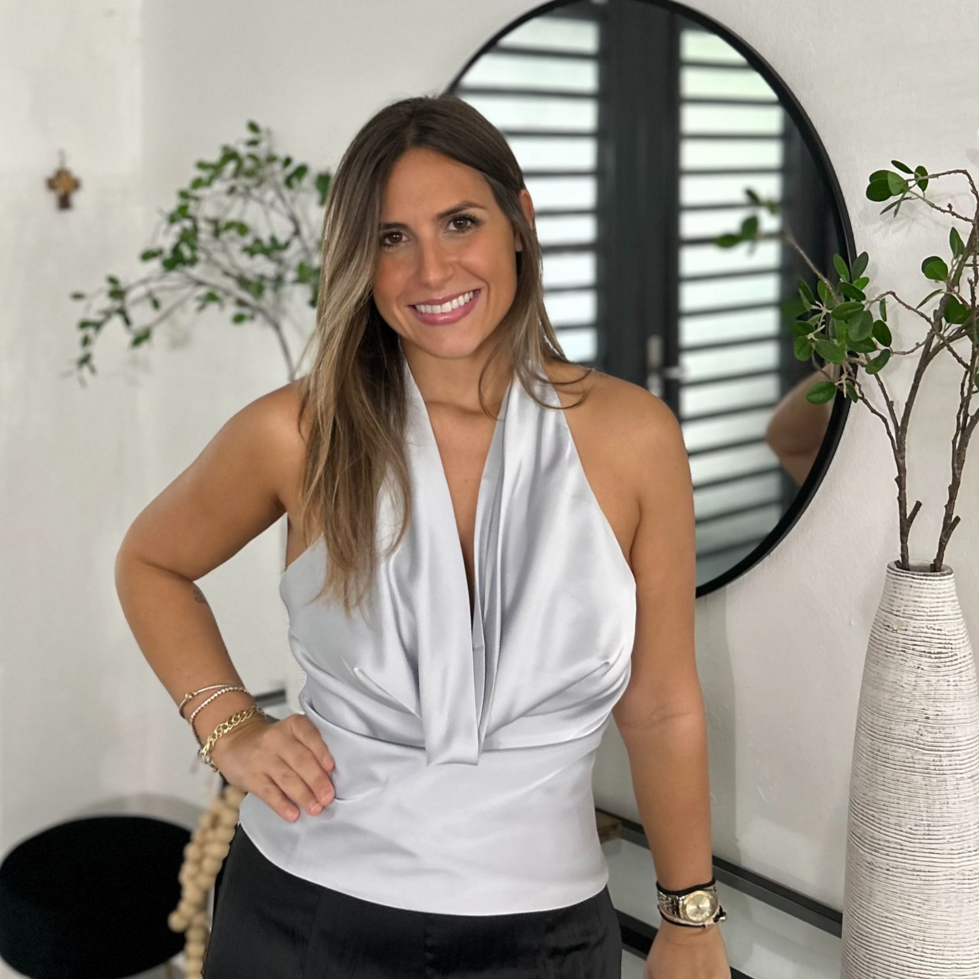 Satin halter with a softly draped neckline, open back, and side zipper for a flattering fit.